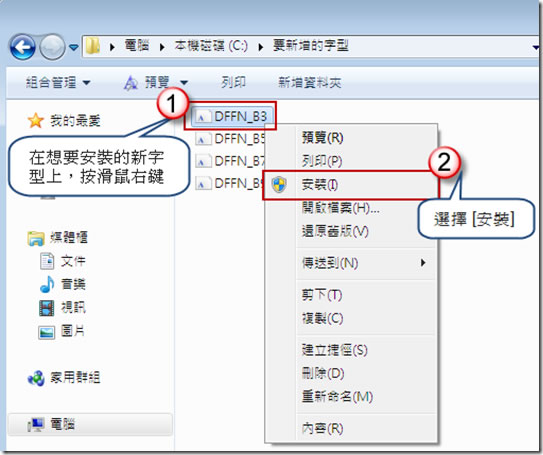 首頁操作技巧Windows 如何在 Windows 7 安裝新字型? 其實 Windows 7 安裝新字型的方式更簡單。 🔔 不錯過任何精彩! 立即訂閱我們的 LINE 官方帳號 每次發佈新文章時,您將會第一時間收到本站文章連結通知,輕鬆掌握最新資訊! 使用 LINE 追蹤文章更新 §相關文章,還可以參閱:學起來!微軟親授 10 個提升 Windows PC 效能的技巧如何升級 Windows 11 25H2?最新版本功能亮點與完整更新步驟Windows 工作列時鐘顯示秒數:真的會影響電池續航力嗎?LTT Labs 完整實測解析Windows 快速取出資料夾檔案名稱清單!內建功能輕鬆搞定,不用額外軟體Windows 11 如何縮小工作列圖示按鈕,打造更精簡桌面視覺 Windows 7 安裝與閱覽新字型方法 1.直接在要安裝新字型上,按滑鼠右鍵,選擇[安裝]就可以了。 2.開啟[控制台]、[外觀及個人化]、[字型],把要安裝的新字型,透過滑鼠拖拉到進去。方法 3.新增完成後可透過 Windows 字型檢視器,了解字型的詳細資訊,並且安裝字型。 使用方式為先選擇字型,然後在功能表上,選擇預覽,或者直接在字型上,滑鼠左鍵點兩下,會透過 Windows 字型檢視器 開啟此字型, 假如想要安裝的話,可以按 [安裝] 按鈕即可。