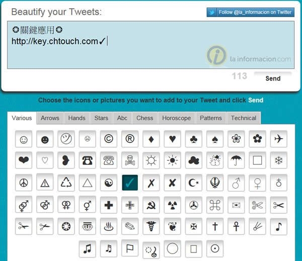 首頁線上工具社群與通訊 Twitter Symbols 讓你在推特發文時可加入更多的特殊符號 雖說 Twitter 的用戶在台灣可能不多,其可能是未能中文化為原因之一,不過若是有使用 Teitter 來發文時想要加入一些特殊符號時,可以來試試 Twitter Symbols 這個可將你的推特帳號做連結又可在發文時加入由 Twitter Symbols 所定義的特殊符號,讓你在發文時,可以增加多點樂趣,而不在單單只是文字。 🔔 不錯過任何精彩! 立即訂閱我們的 LINE 官方帳號 每次發佈新文章時,您將會第一時間收到本站文章連結通知,輕鬆掌握最新資訊! 使用 LINE 追蹤文章更新 §相關文章,還可以參閱:Meta AI 讓 Facebook 大頭貼會動了!還有動態背景、照片風格轉換新玩法馬上爆富超好用!LINE Bank × 胸毛公寓招財貼圖,農曆新年免費領取馬年行大運!精選8款新春招財LINE免費貼圖,OPEN將、罐頭豬陪你過好年「LINE 社群」也能開店!打通聊天到下單的最後一哩路存發票也能玩遊戲!LINE 發票管家改版重點一次看 如何使用 Twitter Symbols ? 1.進入 Twitter Symbols 網站後,可以看到大大的發文輸入框及其下的符號分類頁籤,輸入所要發文的內容及使用符號後,點擊[Send]。 2.接下來就會輸入你在 Twitter 的帳號及密碼。 3.連結上 Twitter 帳號後,再次點擊[Send] 便可發文。 Twitter Symbols網站網址:http://www.simbolostwitter.com/p/english.html