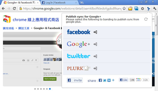 首頁瀏覽器擴充功能社群與通訊 「Google+ & Facebook 同步發表」一處發文就可同步更新到 Facebook、Google+、Twitter 及 Plurk 等社交網站 - Google Chrome 擴充功能 如今社交網站蓬勃發展,一個人同時擁有 Facebook、Google+、Twitter 及 Plurk 等等社交網站是很常見的,不過卻苦了常要發文的網友,若你有此困擾,可以來試試這個「Google+ & Facebook 同步發表」- Google Chrome 的免費擴充功能,其主要就是讓你一處發文就可同步更新到 Facebook、Google+、Twitter 及 Plurk 四種社交網站,相當方便。 🔔 不錯過任何精彩! 立即訂閱我們的 LINE 官方帳號 每次發佈新文章時,您將會第一時間收到本站文章連結通知,輕鬆掌握最新資訊! 使用 LINE 追蹤文章更新 §相關文章,還可以參閱:如何在 Edge 和 Chrome 瀏覽器也能使用 LINE?如何在 Facebook 下載別人的相簿?fbQuickLogin for multiple Facebook 快速切換 Facebook 帳號來登入 - Chrome 瀏覽器擴充功能Facebook Themes 更換 Facebook 背景主題 - Chrome 瀏覽器擴充功能Google+ 通知 - Google Chrome 瀏覽器官方版的擴充功能,讓你掌握 Google+ 社交圈的最新動態! 如何使用 「Google+ & Facebook 同步發表」- Google Chrome 的免費擴充功能? 1.使用 Google Chrome 瀏覽器開啟上述網址後,點擊[加到 Chrome]。 2.安裝完成後,便可看到「Google+ & Facebook 同步發表」擴充功能的圖示,可點擊要同步的社交網站來輸入帳號及密碼來完成同步設定。 3.輸入完成後,再次點擊「Google+ & Facebook 同步發表」擴充功能的圖示,便可看到社交網站的連結帳號。 4.接下來不管你在哪個社交網站發文,其下方均會出現要同步到其他網站的選項,將要同步的社交網站勾選後,便可同步到該網站。 Google+ & Facebook 同步發表性質:免費官方網站:https://chrome.google.com/webstore/detail/aamklbolfkledofgpbdllkangemkfdnb?hl=zh-TW