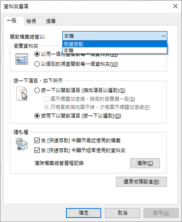 首頁操作技巧Windows [ Windows ]如何更改「檔案總管」開啟時的預設路徑? 在 Windows 10 作業系統中當我們開啟檔案總管時,其預設路徑都會指向「快速存取」這個資料夾,會如此預設,是假設使用者對近期所開啟的檔案,會有較高的存取機率,因此 Windows 會蒐集檔案總管的歷程記錄並將最近開啟的檔案及使用的資料夾,顯示在「快速存取」中方便使用者再次存取,而這樣做法,有時會在開啟檔案總管後,造成檔案總管無回應,原因就在「快速存取」,其解決方案可將檔案總管的歷程記錄清除後,即可正常,如果不想開啟檔案總管就顯示在「快速存取」,可以經過設定將其改在「本機」。 🔔 不錯過任何精彩! 立即訂閱我們的 LINE 官方帳號 每次發佈新文章時,您將會第一時間收到本站文章連結通知,輕鬆掌握最新資訊! 使用 LINE 追蹤文章更新 §相關文章,還可以參閱:你的 Windows 筆電是真睡還是裝睡?一個設定終結背包發熱耗電學起來!微軟親授 10 個提升 Windows PC 效能的技巧如何升級 Windows 11 25H2?最新版本功能亮點與完整更新步驟Windows 工作列時鐘顯示秒數:真的會影響電池續航力嗎?LTT Labs 完整實測解析Windows 快速取出資料夾檔案名稱清單!內建功能輕鬆搞定,不用額外軟體 [ Windows ]如何更改「檔案總管」開啟時的預設路徑? 1.開啟檔案總管後,在[ 檢視 ]功能表中,按[ 選項 ]。 2.在開啟的設定視窗中,我們可以在開啟檔案總管以處,選擇預設開啟後的路徑。 3.另外,在隱私權處,可視需要取消勾選。