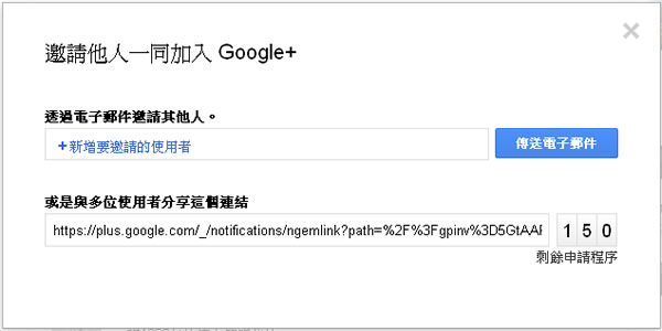 首頁線上工具未分類 Google+ 新增邀請函功能,只有 150個名額 原本在 Google+ 邀請好友的功能是以現在已取得 Google+ 服務的使用者以發送電子郵件信箱來邀請為主,這樣的邀請是需要知道被邀請者的電子郵件信箱,而從現在起有了更方便的「匿名式邀請函」的功能,透過 Google+ 為每位現有的使用者產生一個邀請加入 Google+ 的超連結,利用這個連結可以讓 150 人加入 Google+,可讓你放在個人的部落格、網站、論壇,輕輕鬆鬆就可以在 Google+ 建立你的社交圈。 🔔 不錯過任何精彩! 立即訂閱我們的 LINE 官方帳號 每次發佈新文章時,您將會第一時間收到本站文章連結通知,輕鬆掌握最新資訊! 使用 LINE 追蹤文章更新 §相關文章,還可以參閱:Google 親揭爆紅 AI 模型為何叫「Nano Banana」,答案出乎意料「半夜亂取的名字」爆紅全球!Google揭密 Nano Banana 命名背後的意外故事Luckydraw:最佳線上抽獎工具,適合尾牙、婚禮及各項活動抽獎How Old Do I Look:免費線上 AI 年齡分析工具,輕鬆測試你的看起來年齡Google 宣布 goo.gl 縮址服務即將停止 ,但已建立的永久有效 如何使用 Google+ 新增邀請函功能? 1.登入自己的 Google+ 之後,點擊首頁右側的[邀請好友]。 2.接下來就會出現除原有的輸入電子郵件信箱的邀請方式之外其下方多了一個超連結及剩餘申請程序。 3.將該連結放在個人的部落格、網站、論壇,輕輕鬆鬆就可以在 Google+ 建立你的社交圈。 按我取得 Google+ 邀請函(只有 150個名額) Google+ 邀請函相關網址:按我取得 Google+ 邀請函