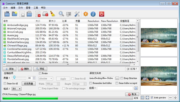 3.加入圖片後,壓縮前的預覽圖為全景圖,可在其下做切換;設定壓縮比率後,選中要預覽壓縮後的項目,點擊[Preview]便可看到壓縮後的縮圖預覽;在其壓縮的項目中,亦可看到壓縮前後的圖檔大小及壓縮比。