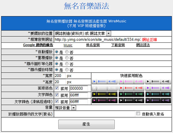 首頁線上工具網頁瀏覽 WreMusic 無名音樂語法產生器,不用 VIP 照樣播音樂 若使用無名小站的免費服務想要在網頁裡嵌入音樂播放器來播放音樂時,其限制為只能為 VIP 的會員,換句話說就是要付費,不過現在你可以透過這個 WreMusic 無名音樂語法產生器,讓你不是 VIP 會員照樣能播音樂,完全免費,使用方式很簡單,只要幾個設定便能完成。 🔔 不錯過任何精彩! 立即訂閱我們的 LINE 官方帳號 每次發佈新文章時,您將會第一時間收到本站文章連結通知,輕鬆掌握最新資訊! 使用 LINE 追蹤文章更新 §相關文章,還可以參閱:Chrome 推出 Auto Browse:讓 AI 自動訂機票、找房子、填表單,還能即時改圖Google 搜尋『67』會發生什麼事?網友實測驚呼:螢幕活了!Google 2025 台灣年度搜尋榜:地震、普發現金、Gemini,我們都在找什麼?ChatGPT Atlas 瀏覽器問世:三大 AI 功能顛覆你的上網方式Microsoft Rewards 點數全自動狂賺法,一鍵設定、天天進帳! 如何使用 WreMusic? 1.使用瀏覽器進入 WreMusic 網站後,要播放的音樂可以自己上傳到相簿空間裡後複製該音樂的網址或是複製他人的在無名相簿或部落格內已有在播放音樂的網址,複製該網址後,貼到頁面相簿音樂網址欄內,若網址正確,其後方會顯示網址正確;接下來設置其他所要參數,設定好之後,點擊[產生]。 2.在下方便會產生出即時預覽與相對應的語法。 複製產生的語法,回到無名後台,在寫文章時,可先點一下工具列上的[編輯html code],即可進入 HTML 編輯模式,然後貼上剛剛複製的音樂語法,即可完成。