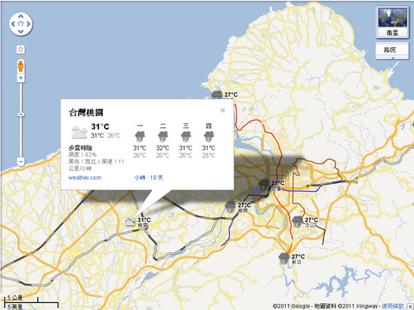 首頁線上工具生活資訊 「Google 地圖」新增天氣預報服務 若現在使用 「Google Map」服務的時候,會發覺到除了原有的功能及先前已加入的即時路況及路況預測服務 等功能之外,現在又增加了天氣預報服務,該服務可顯示當天的溫度、天氣、濕度、風向及風速等資訊,另外還預報後四天的天氣概況,出門旅遊、洽公或商務,「Google 地圖」不但讓你可以規劃路線、避開塞車時段、還可以隨時注意到目的地的天氣資訊,真是方便。 🔔 不錯過任何精彩! 立即訂閱我們的 LINE 官方帳號 每次發佈新文章時,您將會第一時間收到本站文章連結通知,輕鬆掌握最新資訊! 使用 LINE 追蹤文章更新 §相關文章,還可以參閱:Apple Music 台灣新用戶優惠:6個月免費暢聽,領取方式與限制一次看!2026春節追劇清單!Netflix 2月必看攻略:燒腦推理、火爆動作片,陪你從初一爽追到開工!459 萬人搶 60 萬份!運動幣中獎號碼公布,快查你的身分證尾數都馬一起GO!LINE GO新年優惠最高拿$800優惠券,還有一個月乘車金等你抽過年搭高鐵自由座要排多久?看LINE就知道 台灣高鐵×LINE TODAY推出春節限定燈號預估服務 如何使用「Google 地圖」新增天氣預報服務? 1.使用瀏覽器進入 Google Maps 網站後,就可以看到「路況」,滑鼠移到該功能,便會展開,點擊[天氣]即可使用。 2.接下來就會列出台灣各地今天及時的天氣概況。 3.若需知道往後的天氣預報資訊,可點擊該地後,便可列出。 4.若是想到大陸旅遊或出差,同樣的天氣預報服務也可適用。 Google Maps網站網址:http://maps.google.com.tw/