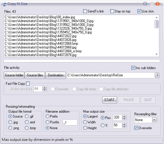 首頁電腦軟體影像繪圖 Copy N Size 改變圖檔尺寸大小,操作簡單(免安裝) 現在的數位相機所拍攝出來的圖片解析度都相當高,SIZE 也都不小,不利我們上傳分享到網路或相簿空間裡,若有此困擾,可以來試試 Copy N Size 這套免費又免安裝的圖檔尺寸大小調整工具,使用方式相當簡單,只需指定要改變的圖檔資料夾、圖檔尺寸、複製目的地得路徑,複製的過程中,就可以開始調整,複製完成就代表也完成圖檔尺寸的變更,很方便。 🔔 不錯過任何精彩! 立即訂閱我們的 LINE 官方帳號 每次發佈新文章時,您將會第一時間收到本站文章連結通知,輕鬆掌握最新資訊! 使用 LINE 追蹤文章更新 §相關文章,還可以參閱:告別訂閱制!Canva 旗下 Affinity 永久免費,向量設計、影像處理、排版工具全面開放Pineapple Pictures 載入速度超快的相片檢視器(免安裝)PhotoResizerOK 可快速調整圖片尺寸的免費軟體ShortDoorNote 將輸入的文字快速轉成圖片Bzzt! Image Editor 圖片批次壓縮、轉檔及尺寸調整的免費工具 如何使用Copy N Size? 1.下載、解壓縮後,執行「CNS.exe」便可開啟,無須安裝。 2.依照自己需求,可點擊[Source Folder]來選取的所存放圖檔的資料夾或是[Source files]來選取多個圖檔;點擊[Destination]來選擇調圖檔整後的存放路徑;在 Max output size 處,設定要調整的圖片尺寸;點擊[START]便可開始轉檔調整。 Output file format:可選擇 Source,使用原格式不轉換或轉換成 JPG、PNG、GIF...等格式 Filename addition:可在圖檔原檔名的前面(Prefix)或後面(Postfix)加上文字,以利區別 Resampling filter:加入濾鏡特效,提供七種 Copy N Size版本:5.0語言:英文性質:免費適用:Windows官方網站:http://chesterway.co.uk/下載:按我下載