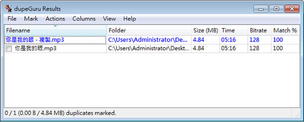 2.稍後下,便可列出比對結果,並列出所在路徑、大小、音樂時間長度、Bitrate 及 Match - 相似百分比。