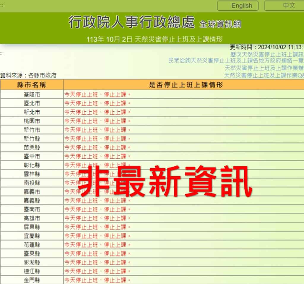 首頁線上工具生活資訊 颱風天停班停課最新資訊查詢:行政院人事行政總處 每當颱風或重大天然災害發生時,大家通常會關注隔天是否停班停課,以便提早做好準備。除了透過新聞頻道獲取這些資訊外,還可以前往「行政院人事行政總處 - 天然災害停止辦公及上課情形」網站,進行最準確的查詢,確保不錯過任何重要公告。 🔔 不錯過任何精彩! 立即訂閱我們的 LINE 官方帳號 每次發佈新文章時,您將會第一時間收到本站文章連結通知,輕鬆掌握最新資訊! 使用 LINE 追蹤文章更新 §相關文章,還可以參閱:AI 醫療新時代:OpenAI 推出 ChatGPT Health,你的專屬健康管理專家租屋族必看!2026 租金補貼完整攻略:申請資格、各縣市金額、審核進度懶人包馬年刮刮樂正式開賣!五路財神等5款怎麼選?中獎率、賺錢率、代碼玄機全解析不再半途而廢!Google Gemini 推出 10 個將目標分解成可執行計畫的提示詞範本,輕鬆達標Apple 獨家提供!AirPods Pro 3 馬年特別款開賣五大亮點一次看 行政院人事行政總處 - 天然災害停止辦公及上課情形 1.使用瀏覽器進入「行政院人事行政總處全球資訊網-天然災害停止上班及上課情形查詢」網站,即可獲取相關資訊。 2.另外,該網站還有提供「各縣市政府民眾洽詢天然災害停止上班及上課各地方政府電話一覽表 」,方便民眾就近找到諮詢窗口。 3.如果需要查詢過往的天然災害停止上班上課情況,也可以到「歷次天然災害停止上班上課訊息」進行查詢。 行政院人事行政總處 - 天然災害停止辦公及上課情形網站網址:https://www.dgpa.gov.tw/typh/daily/nds.html?uid=31
