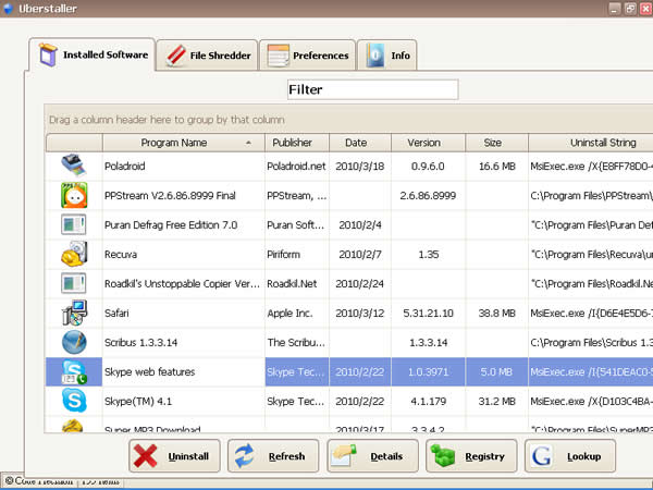 首頁電腦軟體系統應用 Uberstaller 程式移除工具,把已安裝的程式徹底移除! Uberstaller是個免費的程式移除工具,它的功能就好像是微軟作業系統,控制台裡的新增或移除程式,只不過它沒有新增程式這項,Uberstaller它的專業在移除安裝的程式,可以徹底的移除乾淨(如登錄檔、相關目錄...等等),另外,Uberstaller也提供已安裝程式的詳盡資訊,查看所選程式的登錄檔資訊,也提供檔案刪除功能,將要刪除的檔案或資料夾徹底刪除,無法以其它方式救回。 🔔 不錯過任何精彩! 立即訂閱我們的 LINE 官方帳號 每次發佈新文章時,您將會第一時間收到本站文章連結通知,輕鬆掌握最新資訊! 使用 LINE 追蹤文章更新 §相關文章,還可以參閱:CatLock:可鎖定鍵盤的 Windows 應用程式,防止寵物意外觸碰Zen Ad blocker 瀏覽器與應用程式均適用的廣告攔截器,免費且開放原始碼TimVer 一站式顯示 Windows 版本及電腦硬體相關訊息的工具「微軟電腦管家」內含開機啟動項目管理、儲存空間最佳化等免費工具 全方位提升電腦效能Windows Startup Timer 測量 Windows 從開機到完全啟動所需時間 如何使用Uberstaller? 1.安裝好Uberstaller程式,開啟Uberstaller主程式後,便會將所有在系統內進行過安裝的程式全部列出來。 2.此時,若想移除滑鼠選中的程式,只要點擊下方[Uninstall]按紐,便會開始移除程序 3.點擊[Uninstall]後,移除程序視窗便會出現。 4.點擊[Next],便會出現一個對話框,詢問是否要移除。 5.點擊對話框的[是]確認要移除,開始移除步驟。 6.點擊[Launch]開始移除 7.若要徹底刪除檔案,切換到[File Shredder]頁籤,將要刪除的檔案或資料夾,使用滑鼠拖拉放到開頁籤內後,點擊閃電按鈕,便會出現對話框,告訴你在這裡刪除的檔案或資料夾即使你是使用一些救援軟體也是無法回覆的,點擊[是]便會刪除。 Uberstaller版本:2.0.1語言:英文性質:免費適用:Windows官方網站:http://uberstaller.com/下載:按我下載