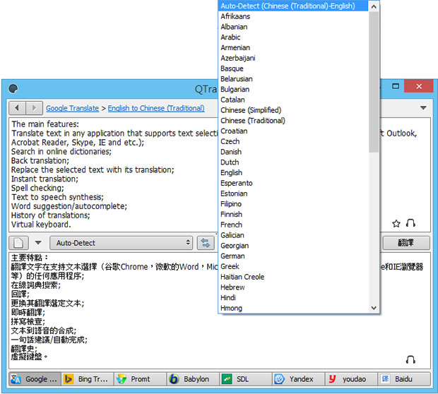 QTranslate 是一套集合了 Google Translate、Bing Translator、Promt、Babylon、SDL FreeTranslation.com、Yandex.Translate、youdao、Naver 與 Baidu 等多種線上翻譯服務的免費工具。