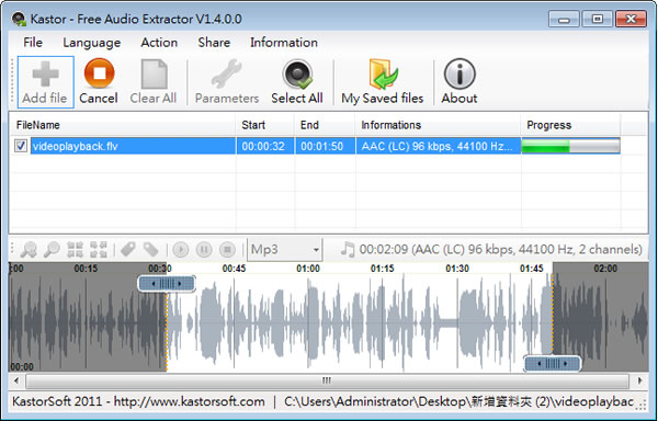 首頁電腦軟體影音視聽 Kastor Free Audio Extractor 擷取影片中聲音的免費工具 覺得影片中的對白或音樂相當經典,想要擷取出來時,可以來試試這套 Kastor Free Audio Extractor 可擷取影片中的聲音及聲音轉檔的免費工具,可支援 FLV、MP4、AVI、WMV、MOV、M4A、MP3 及 AAC 等格式轉換,使用 Kastor Free Audio Extractor 的好處除了操作相當直覺,可快速入門之外,另外可設定所要的影片或聲音檔案的片段即可,不需要重頭轉到尾,完成後再利用其他的工具軟體來切割。 🔔 不錯過任何精彩! 立即訂閱我們的 LINE 官方帳號 每次發佈新文章時,您將會第一時間收到本站文章連結通知,輕鬆掌握最新資訊! 使用 LINE 追蹤文章更新 §相關文章,還可以參閱:超實用免費軟體!DCP-o-matic 讓你的影片變成電影院 DCP 播放格式語音轉文字免費工具 AsrTools 輕鬆搞定字幕、筆記或歌詞整理免費的 PotPlayer 開始搭載 Whisper AI,讓你即時生成字幕與翻譯,外語影片輕鬆看SpleeterGUI:簡單易用的 AI 音軌分離免費開源工具如何使用 Microsoft Clipchamp 自動產生影片字幕? 如何使用Kastor Free Audio Extractor? 1.安裝好開啟 Kastor Free Audio Extractor 後,點擊[Add file]來選擇要擷取聲音的影片或轉檔的聲音檔案。 2.選擇轉換格式;若想要影片中片段的聲音,可使用滑鼠來拖動左、右兩側的起始設定按鈕來設定範圍 3.點擊[Parameters]可對所選轉檔格式進行細項設定。 4.都設定好之後,點擊[Save as(所選格式)]便會開始轉換。 Kastor Free Audio Extractor版本:1.5.0.0語言:英文性質:免費適用:Windows官方網站:http://www.kastorsoft.com/index_en.php下載: 按我下載 按我前往官網下載