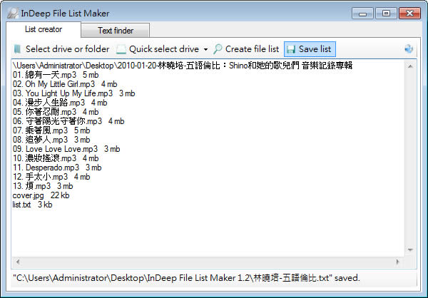 首頁電腦軟體檔案管理 InDeep File List Maker 輕鬆建立 CD 或 DVD 內的檔案清冊(免安裝) 買了原版的 CD 或 DVD,通常會轉燒錄複製一份來使用,以保護原版的光碟片,不過若經常燒錄又沒有做好註記,時間久了也就忘了光碟片的內容,實在不容易找出,InDeep File List Maker 就可以很輕鬆地幫我們列出光碟片中的檔案名稱,例如你燒錄了一片 CD 音樂專輯,就可以輕鬆列出光碟片中所有的歌曲名稱,讓我們可以貼在光碟片的封面上,這樣下次要找出轉燒錄的光碟片時,一點都不難。 🔔 不錯過任何精彩! 立即訂閱我們的 LINE 官方帳號 每次發佈新文章時,您將會第一時間收到本站文章連結通知,輕鬆掌握最新資訊! 使用 LINE 追蹤文章更新 §相關文章,還可以參閱:檔案好多重複怎麼辦?免費 dupeGuru 幫你一鍵清出電腦空間[ 免費使用 ]PDFgear 整合各種 PDF 工具,具格式轉換、編輯、合併或拆分等功能7-Zip 檔案壓縮與解壓縮免費軟體AmoK Exif Sorter 讓照片按拍照日期重新命名並自動分類的免費軟體PDF Unshare 限制 PDF 檔案的讀取有效日期 如何使用InDeep File List Maker? 1.下載、解壓縮後,執行「File List Maker.exe」便可開啟,無須安裝。 2.開啟後,在 List creator 頁籤中,例如要列出光碟機內所有的檔案名稱 Select drive or folder - 選擇磁(光)碟機或資料夾 Quick select drive - 快速選擇磁(光)碟機 點擊[Select drive or folder]來選擇要列出檔案名稱的資料夾或光碟機。 3.選擇好之後,點擊[Create file list]便會列出該光碟或資料夾內的所有檔案名稱。 4.列出後,可點擊[Save list]來存成文字檔後列印出;另外在 Text finder 也可以讓我們來搜尋所存檔的檔案名稱清冊。 InDeep File List Maker版本:1.2語言:英文性質:免費適用:Windows官方網站:http://indeepsoft.blogspot.com/2010/04/indeep-file-list-maker.html下載:按我下載 系統需求:Microsoft .Net Framework 3.5 或更高版本