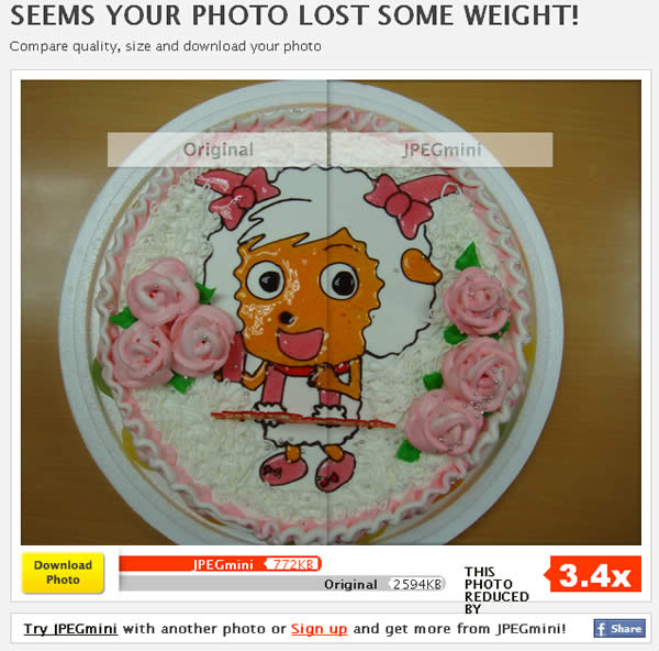 首頁線上工具影像繪圖 JPEGmini 讓你壓縮圖片又不失品質的免費線上工具 現在的數位相機其解析度都很高,相對的其圖檔也較大,儲存也很浪費硬碟空間,更不適合分享到網頁裡,如何才能將圖片壓縮到最小又能保持圖片的品質,若有此困擾時,可以來試試這個 JPEGmini 讓你壓縮圖片又不失品質的免費線上工具,可預覽對比壓縮前後的圖片,JPEGmini 的壓縮效果有多好呢?我們可以從其官網上的圖片得知。 🔔 不錯過任何精彩! 立即訂閱我們的 LINE 官方帳號 每次發佈新文章時,您將會第一時間收到本站文章連結通知,輕鬆掌握最新資訊! 使用 LINE 追蹤文章更新 §相關文章,還可以參閱:Put!所見即所得的 AI 提示詞圖庫:讓你看著範例圖,複製就能做出同級作品Google 親自示範:Nano Banana AI 圖像編輯工具的 13 個熱門玩法照片角度不滿意?AI 幫你調整!3D Camera Control 讓舊照片任意變換視角Meta AI 免費帳戶也能用 Midjourney!無限生成 AI 圖片,台灣可用Nano Banana Pro 幫你放煙火,地點、形狀由你指定 如何使用 JPEGmini? 1.進入 JPEGmini 網站後,點擊[Select Photos]來選擇要上傳的圖片(JPEG、JPG 格式)。 2.選擇好之後便會立刻上傳且進行壓縮,壓縮完成後會給壓縮出前後的比對圖,可使用滑鼠移至圖片上方左右移動來觀察壓縮前後的差別,圖片下方會列出原圖檔及壓縮後大小。 3.點擊[Download Photo]便可下載回自己的電腦,下圖為壓縮前後比對。 (原始圖片) (壓縮後圖片) JPEGmini網站網址:http://www.jpegmini.com/main/shrink_photo