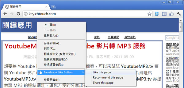 3.對於自己喜愛的網頁,使用滑鼠右鍵點擊,便可看到 Facebook Like Button 的功能表,對網頁會出現:
