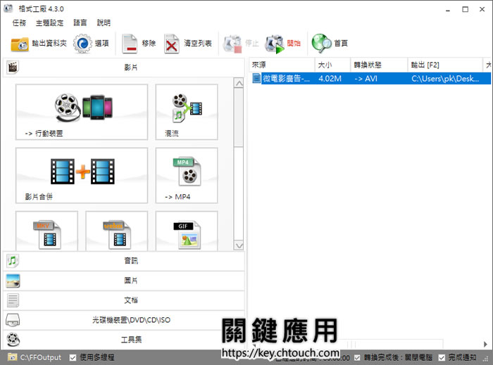 6.回到原視窗,點擊[確定]後,會將工作加入工作清單中,再按下[開始]即可開始進行轉檔工作,如果你需要轉檔完成後由系統幫你關閉電腦,可勾選最右下角[轉換完成後,關閉電腦]。
