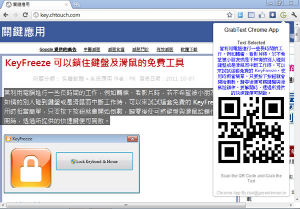 首頁瀏覽器擴充功能生產力工具 GrabText 將網頁上的任何文字轉成 QR Code,輕鬆複製到手機上 使用 Google Chrome 瀏覽器瀏覽網頁時,想要將閱讀的資訊複製到手機時,可以來試試這個 GrabText 免費的Chrome 瀏覽器擴充功能,安裝後,只要將要讀取到手機的文字選取後,再點擊 GrabText 擴充功能,便能將該段文字直接轉成 QR Code,接下來只要使用手機讀取 QR Code 的功能,便可將該段文字複製到手機上,相當方便。 🔔 不錯過任何精彩! 立即訂閱我們的 LINE 官方帳號 每次發佈新文章時,您將會第一時間收到本站文章連結通知,輕鬆掌握最新資訊! 使用 LINE 追蹤文章更新 §相關文章,還可以參閱:Bing Chat sidebar for Chrome 讓 Chrome 在側邊欄就能使用 Bing Chat(瀏覽器擴充功能)如何在 Chrome 瀏覽器也能使用全新的 Bing AI?「UseChatGPT.AI」快速編寫、改寫、總結、解釋或翻譯網站上的任何文章 (瀏覽器擴充功能)WebChatGPT 結合網路搜尋資料,讓 ChatGPT 整合資訊沒有時間限制(瀏覽器擴充功能)ChatGPT Prompt Genius 將 ChatGPT 對話內容完整的匯出成 PNG、PDF、MD 檔或分享網址(瀏覽器擴充功能) 如何安裝及使用 GrabText ? 1.使用 Chrome 瀏覽器到達 GrabText 安裝網址後,點擊[加到 Chrome]便會開始下載及安裝。 2.安裝完成後,會出現提示。 3.需要將網頁上的文字轉成 QR Code 時,只需將要轉換的文字複製後,再點擊 GrabText ,便可轉出 QR Code,開啟手機的 QR Code 掃瞄功能便可將該段文字複製到手機上。 GrabText性質:免費官方網站:https://chrome.google.com/webstore/detail/pmkkkpcojlkfgkgoiilkgfkeaiaocehb