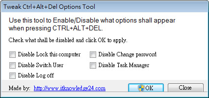 首頁電腦軟體系統應用 Tweak Ctrl+Alt+Del Options Tool 可關閉或開啟按下 Ctrl+Alt+Del 後的選項按鈕免費工具(免安裝) 在 Windows 7 系統中,若是按下鍵盤的 Ctrl+Alt+Del 按鈕後,可以叫出「鎖定此電腦」、「切換使用者」、「變更密碼」、「登出」 及「啟動工作管理員」等五個選項按鈕,若你是電腦的管理者,並不希望使用者有太多的選項可供選擇,而希望關閉某些選項時,可以來試試這套免費又免安裝的 ITknowledge24 Tweak Ctrl+Alt+Del Options Tool,讓你輕鬆的管理按下 Ctrl+Alt+Del 按鈕後的選項按鈕。 🔔 不錯過任何精彩! 立即訂閱我們的 LINE 官方帳號 每次發佈新文章時,您將會第一時間收到本站文章連結通知,輕鬆掌握最新資訊! 使用 LINE 追蹤文章更新 §相關文章,還可以參閱:CatLock:可鎖定鍵盤的 Windows 應用程式,防止寵物意外觸碰Zen Ad blocker 瀏覽器與應用程式均適用的廣告攔截器,免費且開放原始碼TimVer 一站式顯示 Windows 版本及電腦硬體相關訊息的工具「微軟電腦管家」內含開機啟動項目管理、儲存空間最佳化等免費工具 全方位提升電腦效能Windows Startup Timer 測量 Windows 從開機到完全啟動所需時間 如何使用 ITknowledge24 Tweak Ctrl+Alt+Del Options Tool? 1.當按下 Ctrl+Alt+Del 按鈕後的選項按鈕。 2.下載、解壓縮後,執行「editctaldl.exe」便可開啟無須安裝。 3.開啟後,勾選要關閉的按鈕,按下[OK]。 Disable Lock this computer - 關閉「鎖定此電腦」的按鈕 Disable Switch User - 關閉「切換使用者」的按鈕 Disable Log off - 關閉「登出」的按鈕 Disable Change password - 關閉「變更密碼」的按鈕 Disable Task Manager - 關閉「啟動工作管理員」的按鈕 4.下圖為全部勾選後,再按下 Ctrl+Alt+Del 按鈕後的選項按鈕。 ITknowledge24 Tweak Ctrl+Alt+Del Options Tool語言:英文性質:免費適用:Windows官方網站:http://www.itknowledge24.com/下載:按我下載