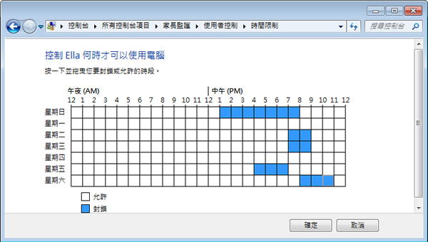 首頁操作技巧Windows 「Windows 7」如何利用內建「家長監護」功能,控制小孩使用電腦時間、允許或封鎖特定程式、遊樂場等? 若家中的小朋友沉迷於電腦遊戲或是使用電腦的時間過長時,該用什麼樣的方式來控制呢?若是使用 Windows 7系統,可以來試試已內建的「家長監護」功能,該功能可以控制每個帳戶的電腦使用時間、允許或封鎖特定程式及遊樂場等項目,設定好之後,就不用怕自己不在家,而小朋友沉迷於電腦世界。 🔔 不錯過任何精彩! 立即訂閱我們的 LINE 官方帳號 每次發佈新文章時,您將會第一時間收到本站文章連結通知,輕鬆掌握最新資訊! 使用 LINE 追蹤文章更新 §相關文章,還可以參閱:你的 Windows 筆電是真睡還是裝睡?一個設定終結背包發熱耗電學起來!微軟親授 10 個提升 Windows PC 效能的技巧如何升級 Windows 11 25H2?最新版本功能亮點與完整更新步驟Windows 工作列時鐘顯示秒數:真的會影響電池續航力嗎?LTT Labs 完整實測解析Windows 快速取出資料夾檔案名稱清單!內建功能輕鬆搞定,不用額外軟體 如何利用 Windows 7 內建「家長監護」功能,控制小孩使用電腦時間、允許或封鎖特定程式、遊樂場等? 1.開啟控制台後,點擊「家長監護」。 2.開啟後,點擊要控制的使用者帳戶。 ※你必須是電腦管理員才可以設定。 ※被控制的帳戶不可以具有電腦管理員的身分。 3.預設家長監護會是在關閉狀態,點擊[開啟,強制目前的設定]來開啟家長監護功能。 4.點擊[時間限制]可以設定使用者可以使用電腦的時段,藍色為封鎖,白色為開放,預設均為開放狀態,使用滑鼠點擊要封鎖的時段,便會以藍色來呈現。 5.遊樂場,點擊[封鎖或允許特定遊戲]可以控制使用者可以玩已安裝在電腦內的遊戲。 6.允許或封鎖特定程式 - 可限定使用者可以使用的應用程式。