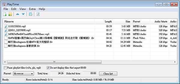 首頁電腦軟體影音視聽 利用 PlayTime 來計算影片或音樂檔案播放的總時間(免安裝) 有時候我們會想要知道在列表中所要播放的音樂或影片其可播放的總時間有多長時,該怎麼做呢?若你有此需求時,可以來試試 PlayTime 這套免安裝又免費的工具軟體,來計算所要播放的影片或音樂檔案其播放總時間。 🔔 不錯過任何精彩! 立即訂閱我們的 LINE 官方帳號 每次發佈新文章時,您將會第一時間收到本站文章連結通知,輕鬆掌握最新資訊! 使用 LINE 追蹤文章更新 §相關文章,還可以參閱:超實用免費軟體!DCP-o-matic 讓你的影片變成電影院 DCP 播放格式語音轉文字免費工具 AsrTools 輕鬆搞定字幕、筆記或歌詞整理免費的 PotPlayer 開始搭載 Whisper AI,讓你即時生成字幕與翻譯,外語影片輕鬆看SpleeterGUI:簡單易用的 AI 音軌分離免費開源工具如何使用 Microsoft Clipchamp 自動產生影片字幕? 如何使用 PlayTime? 1.下載、解壓縮後,滑鼠雙擊「PlayTime.exe」便可開啟 PlayTime,無須安裝。 2.開啟後,可使用滑鼠將音樂或影片拖曳進 PlayTime 的列表框中或點擊[File] > [Add files] 或 [Add folder]來加入要計算播放時間的影片或音樂檔。 3.加入後,便會看到列表中每個項目的播放單一時間,下方處便有總時間。 如上圖所示,3個 MP3 及 FLV 檔案,Total time 播放總時間為 24:26 。 PlayTime版本:1.5.3語言:英文性質:免費適用:Windows官方網站:https://www.dcmembers.com/skwire/download/playtime/下載:按我下載