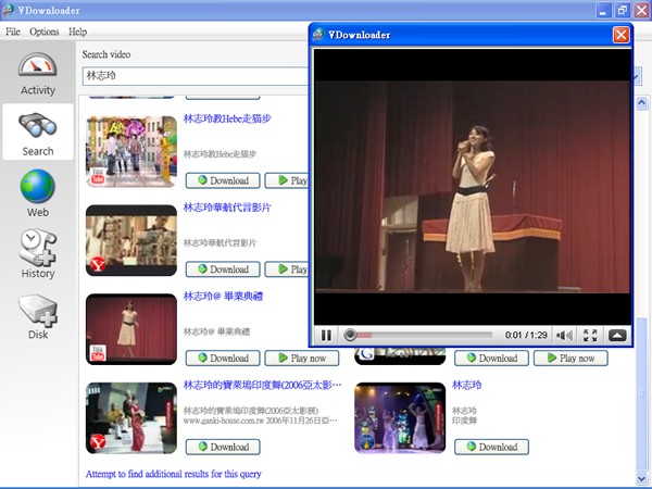1.如果我們想要進行影片的搜尋,開啟VDownloader後,切換到[Search]頁籤,並在 Search Video筐裡輸入搜尋的關鍵字後,點擊[Search],VDownloader便會將搜尋到的影片列出。