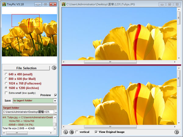 在預覽窗格中,上方為壓縮後,下方為原始圖檔