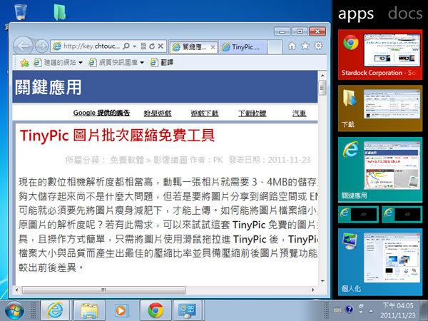 首頁電腦軟體視窗桌面 Stardock Tiles 實用的桌面工具列 Stardock Tiles 是一套相當實用的桌面工具列免費軟體,安裝後,會在桌面延伸出一條工具列,該工具列除了可分類來組織常用的應用程式與文件之外,還可以用來管理正在運行的應用程序,其操作方式是應用目前相當流行用於行動裝置的手指滑動,只不過將手指換成用滑鼠來操作,不用時可隱藏,是相當類似於 Windows 自身的工具列。 🔔 不錯過任何精彩! 立即訂閱我們的 LINE 官方帳號 每次發佈新文章時,您將會第一時間收到本站文章連結通知,輕鬆掌握最新資訊! 使用 LINE 追蹤文章更新 §相關文章,還可以參閱:Windows 官方桌布商店來了!超過 400 款風格包,從遊戲到國家公園通通有微軟 City Art Search 自動將 10400多幅世界名畫設置成 Windows 鎖定螢幕畫面Digital Clock 4 可靈活自訂的桌面時鐘,支援報時、計時器、鬧鐘等多款附加套件TrafficMonitor 在 Windows 桌面上顯示網路上傳與下載的即時網速「免費下載」故宮博物院 2023 兔年月曆桌布 如何使用Stardock Tiles? 1.下載、安裝並開啟 Stardock Tiles 後,在桌面視窗的右側便會出現一條工具列。 2.要操作換分頁或上下移動時,可使用滑鼠當作手指來滑動分頁或上下滑動,可參閱影片介紹。 3.Stardock Tiles 預設有三個頁籤,my tiles、apps 及 docs 均可自訂名稱,其中 apps 會自動將現在在 Windows 中運行的應用程序列出;my tiles 及 docs 可使用滑鼠將要組織的應用程式或文件檔案,拖曳到頁籤內便可完成釘選。 4.滑鼠右鍵點擊工具列後,點選[Configure Stardock Tiles...]按鈕,便可開啟設定視窗。 Stardock Tiles版本:0.98語言:英文性質:免費適用:Windows官方網站:http://www.stardock.com/corporatesolutions/Tiles/下載:按我下載