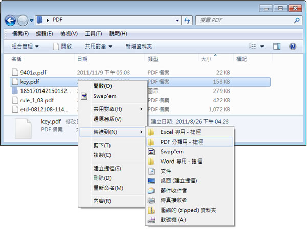 首頁操作技巧Windows 如何自訂 Windows 7 在檔案或資料夾上按下滑鼠右鍵時的「傳送到」內選項? 在 Windows 系統中,對於檔案或資料夾的刪除、複製、剪下、重新命名...等等的操作,通常都可以在其上按下滑鼠右鍵後在所出現的功能選項來快速完成,另外,除了這些標準的操作功能外,其中「傳送到」的功能可以讓我們快速的將檔案或資料夾傳送到我們指定的標的物例如電子郵件、傳真收件者...等等,不過「傳送到」裡面的功能選項,通常都是系統預設或是安裝了某項應用程式後所加入的,若自己也想自訂「傳送到」 的標的物時例如印表機、常用的分類資料夾...等等,該如何來操作呢? 🔔 不錯過任何精彩! 立即訂閱我們的 LINE 官方帳號 每次發佈新文章時,您將會第一時間收到本站文章連結通知,輕鬆掌握最新資訊! 使用 LINE 追蹤文章更新 §相關文章,還可以參閱:你的 Windows 筆電是真睡還是裝睡?一個設定終結背包發熱耗電學起來!微軟親授 10 個提升 Windows PC 效能的技巧如何升級 Windows 11 25H2?最新版本功能亮點與完整更新步驟Windows 工作列時鐘顯示秒數:真的會影響電池續航力嗎?LTT Labs 完整實測解析Windows 快速取出資料夾檔案名稱清單!內建功能輕鬆搞定,不用額外軟體 如何自訂 Windows 7 在檔案或資料夾上按下滑鼠右鍵時的「傳送到」內選項? 1.在[開始]功能表的[搜尋程式及檔案]方塊中輸入:shell:sendto 後,按下鍵盤的[Enter]按鈕。 2.接下來便會開啟內含「傳送到」 功能的資料夾,依照不同的使用者,預設路徑是在 C:\Users\[使用者]\AppData\Roaming\Microsoft\Windows\SendTo 3.若要自訂裡面的功能表,只需將應用程式、資料夾、檔案的捷徑拖拉到該資料夾內即可或是滑鼠右鍵點擊來建立捷徑或要分類的資料夾。 4.當下次有需要使用到「傳送到」內的功能時,將會更方便。
