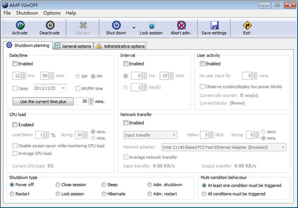 多數的自動關機免費工具,大都以固定時間為主,例如幾點的時候便自動關機,若是想要有較複雜的關機條件,例如使用者滑鼠鍵盤輸入閒置時間、CPU 使用率,甚至於設定當網路流量在一段時間內小於多少 KB就自動關機時,可以來試試這套 AMP WinOFF 免安裝又免費的電腦定時關機工具,AMP WinOFF 可執行的工作不僅僅於關機,重新開機、強迫關閉程式,可以使用管理者權限強制關機並顯示警告訊息 、休眠等均可操作,對於需要有較複雜條件來自動關機的使用者而言,絕對可以符合需求。