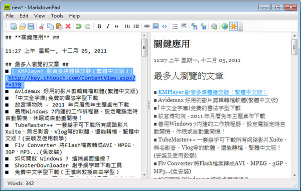 想要將文件轉換成 HTML / XHTML 的網頁格式,最快速的方法莫過於使用 Microsoft 的 Office 系列來轉換,不過使用這種方法轉出的 HTML 網頁原始碼,常會加入 Word 或是 Excel 的排版編碼,也因此在非 IE 瀏覽器開啟時,會產生排版跑掉的,若你需要將文件轉換成 HTML / XHTML 的網頁格式時,可以來試試這套 MarkdownPad 免費工具,使用起來就像使用 Word 一樣簡單,可讓你可以即時預覽轉換後的樣式,又不會加入 Office 特有的編版碼,有需要朋友可以來試試喔。