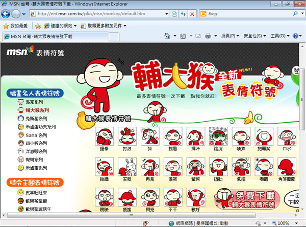 還在找MSN(Windows Live Messenger)的表情符號嗎?那就到微軟的官方網站下載吧!我們常用的像﹝馬克系列、輔大猴系列、兔斯基系列、米滷蛋功夫系列、Sana 系列、四小折系列、洋蔥頭系列、洋蔥頭系列、彎彎系列、7-11 表情符號...等等﹞,微軟都幫我們準備好了,只需要簡單的操作就可以將表情符號匯入到MSN(Windows Live Messenger)裡,除此之外,微軟還依照﹝時令主題、創意主題﹞區分不同的表情符號系列,讓你依照節日、場合或流行可以適時的更換,有興趣的朋友可以來試試!