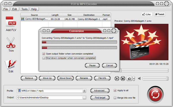 首頁電腦軟體檔案管理 FLV to MP4 Encoder 影音轉檔、剪輯、編修、合併免費工具 FLV to MP4 Encoder 影音轉檔免費工具, 乍看軟體名稱會以為只能將 FLV 轉成 MP4 影音格式,其實不然,FLV to MP4 Encoder 可支援的輸入的影音格式有 3GP、MP4、MPG、AVI、AVM、ASF、MPEG、WMV、DAT、OGM、VOB、RM、AVS、FLV、MKV、MOV、RMVB、TS、TP 等,但是轉換後的輸出就只有 MP4 一種影音格式,其他的功能像是影片片段擷取成圖片、合併、剪輯、預覽、簡易編輯一應俱全。 🔔 不錯過任何精彩! 立即訂閱我們的 LINE 官方帳號 每次發佈新文章時,您將會第一時間收到本站文章連結通知,輕鬆掌握最新資訊! 使用 LINE 追蹤文章更新 §相關文章,還可以參閱:檔案好多重複怎麼辦?免費 dupeGuru 幫你一鍵清出電腦空間[ 免費使用 ]PDFgear 整合各種 PDF 工具,具格式轉換、編輯、合併或拆分等功能7-Zip 檔案壓縮與解壓縮免費軟體AmoK Exif Sorter 讓照片按拍照日期重新命名並自動分類的免費軟體PDF Unshare 限制 PDF 檔案的讀取有效日期 如何使用FLV to MP4 Encoder? 1.下載並安裝好,開啟 FLV to MP4 Encoder 後,使用滑鼠拖曳到指定位置或點擊[File] > [Add video files]來加入要轉檔的影音檔案。 2.若需要剪輯影片片段,可點擊[Trim]來開啟剪輯視窗,並調整起始的影片段落後,點擊[剪輯]。 3.若要設定 MP4 的轉檔品質參數,可點擊[Advanced...]。 4.確定好之後,點擊主程式右下角的圓形按鈕來進行轉檔。 FLV to MP4 Encoder語言:英文適用:Windows官方網站:http://www.flvtomp4.com/下載:按我下載