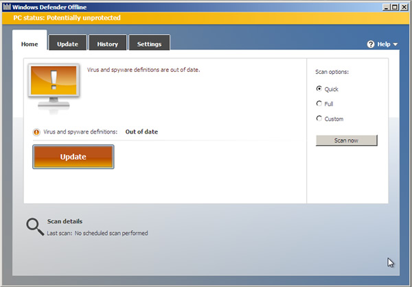 8.載入必要檔案後,便會進入 Windows Defender Offline 介面,掃描前可先按[Update]來更新 Windows Defender Offline ,在 Scan Option 選擇要掃描的類型 Quick - 快速;Full - 完整;Custom - 自訂,選擇好之後,按下[Scan Now]便開始掃描。