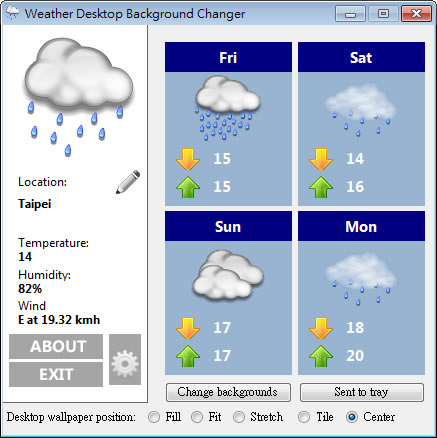 首頁電腦軟體生活資訊 Weather Desktop Background 天氣預報桌面應用免費工具 近來天氣變化大,沒時間看電視的氣象報告,可以來安裝 Weather Desktop Background 天氣預報桌面應用免費工具,安裝後,會顯示目前即時的最高、最低氣溫與天候,並在桌面上顯示目前所預測的即時天候狀況。 🔔 不錯過任何精彩! 立即訂閱我們的 LINE 官方帳號 每次發佈新文章時,您將會第一時間收到本站文章連結通知,輕鬆掌握最新資訊! 使用 LINE 追蹤文章更新 §相關文章,還可以參閱:Opal 可自由混搭雨聲、風聲、交通聲...等 17種環境音播放器地牛Wake Up! - 電腦版的地震速報免安裝「姓名吉凶分析」輸入姓名就幫你分析吉凶Complete Anatomy 使用 3D 了解人類身體結構樂透選號機 - 大樂透、樂透彩、今彩 539、樂線 9宮格號碼產生器(免安裝) 如何使用Weather Desktop Background? 1.下載後取得的檔案為 RAR 壓縮檔,需使用解壓縮軟體進行解壓縮,若無解壓縮軟體,可參考 7-ZIP 免費的壓縮及解壓縮軟體,使用教學(繁體中文版) 、 PeaZip免費的壓縮及解壓縮軟體(免安裝繁體中文版) 及 HaoZip 媲美Winrar的免費壓縮及解壓縮軟體(繁體中文版) 來取得免費的解壓縮軟體,解壓縮完成後即可進行安裝,完成後,開啟 Weather Desktop Background 主程式。 2.可點擊 Location 旁的筆型圖示,來設定要顯示的城市。 3.點擊 About 旁的齒輪圖示,可設定天氣資料更新時間及使用攝氏或華氏來顯示。 4.在桌面上則會顯示定義好的預測背景,點擊[Change backgrund],這個背景可以自行更換,例如下雨、晴天...等等時要顯示的圖檔,雙擊要更換的圖檔,便可開啟選擇圖檔視窗。 Weather Desktop Background版本:2.0.0.0語言:英文性質:免費適用:Windows 7官方網站:http://dejco.deviantart.com/art/Weather-Desktop-Background-186133293下載:按我下載