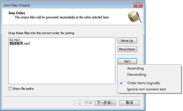 首頁電腦軟體影音視聽 JoinExt - MP3 合併免費工具 想要將某段 MP3 聲音不斷重複來播放,若機器設備沒有支援重複播放的功能,那就將該段聲音使用合併的方式來達到重複播放的功能,例如想要聽熟某段英語教學、文章或是想製作不斷重複的叫賣聲,若是有這個需求可以來試試 JoinExt 這套 MP3 合併免費工具,簡單又好用。 🔔 不錯過任何精彩! 立即訂閱我們的 LINE 官方帳號 每次發佈新文章時,您將會第一時間收到本站文章連結通知,輕鬆掌握最新資訊! 使用 LINE 追蹤文章更新 §相關文章,還可以參閱:超實用免費軟體!DCP-o-matic 讓你的影片變成電影院 DCP 播放格式語音轉文字免費工具 AsrTools 輕鬆搞定字幕、筆記或歌詞整理免費的 PotPlayer 開始搭載 Whisper AI,讓你即時生成字幕與翻譯,外語影片輕鬆看SpleeterGUI:簡單易用的 AI 音軌分離免費開源工具如何使用 Microsoft Clipchamp 自動產生影片字幕? 如何使用JoinExt? 1.下載並安裝好之後,即可將要合併的 MP3 檔案使用滑鼠圈選起來,然後按下右鍵,點選[Join Files...]。 2.接下來會開啟 JoinExt 的合併視窗,可透過右邊的 Move Up 或 Move Down 來調整順序;Sort 則可用來排序,若要顯示檔案的完整路徑則可勾選[Show file paths],點擊[下一步]。 3.接下來給予合併後的檔案名稱後,點擊[下一步]。 4.開始合併。 JoinExt版本:0.0.145.697語言:英文性質:免費適用:Windows官方網站:http://www.mutexed.com/code/JoinExt/下載:按我下載