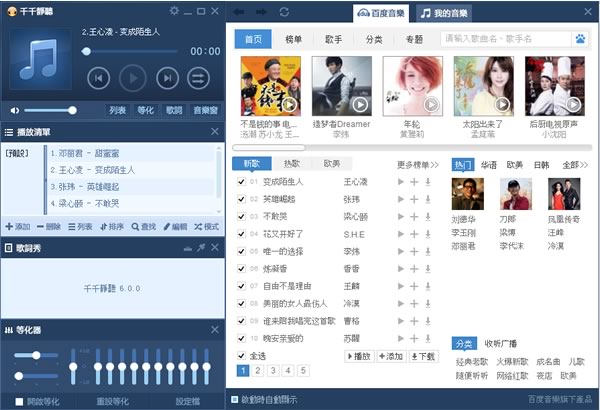 千千靜聽(ttplayer) 已更名為百度音樂是一個功能完整、執行效能與音質都相當不錯的音樂播放器,除了支援大部分常見的音樂格式之外,另一個深受大家喜愛的功能就是支援「網路自動下載歌詞」,可以不用到處找歌詞,當使用千千靜聽播放歌曲時它會自動比對、下載相對應的歌詞,一邊聽歌、一邊就有歌詞可以對照著看,相當貼心。千千靜聽還有另一個特色就是「歌曲推薦」,可以直接將推荐列表內的歌曲直接加入播放清單,直接線上播放,其他的一些附加功能像是音樂格式轉換,可以在MP3、WMA等多種音樂格式之間進行轉換,還有超多的面板可供自由更換...等等,是一套相當好用的音樂播放軟體,推薦給大家!