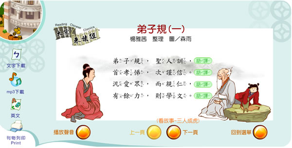 首頁教育學習學習資源 弟子規 - 讀經影音教材,適合所有年齡層的小朋友來學習,還可下載語音檔 「弟子規」是由僑委會提供的線上讀經教材,共分為 45篇,每篇皆可下載教材、MP3,並配有文言文語譯、英文翻譯及補充閱讀的故事,文字內容均有標註注音符號,並提供語音說故事,除此之外,內文的所有文字、語音均可下載與列印,相當適合所有年齡層的小朋友來學習。 🔔 不錯過任何精彩! 立即訂閱我們的 LINE 官方帳號 每次發佈新文章時,您將會第一時間收到本站文章連結通知,輕鬆掌握最新資訊! 使用 LINE 追蹤文章更新 §相關文章,還可以參閱:研究生的福音來了!OpenAI Prism 自動幫你找文獻、排版、畫圖AI 運算的雙雄對決:解析 GPU 與 TPU 的差異與應用AI 心智圖備考術:用 Nano Banana Pro 拆解高普考範圍2026 QS 亞洲大學排名,亞洲前10排名、台灣57校上榜排名一次看免費版也能用 Google Gemini 引導式學習模式,讓 AI 家教帶你深度學習任何知識領域 弟子規 - 使用說明 1.進入弟子規網站後,會列出所有的章節,點擊其中之一,便可進入。 2.進入故事後,左側欄有提供故事內容的文字下載、說故事的語音 MP3下載、ABC 的英文版本切換,若是要列印,可點擊[刊物列印];若要開始故事內容,可先按下[播放聲音]後,依其進度點擊[下一頁]。 3.英文版。 建議你可以將所有 MP3語音檔案全部下載後,燒錄成 CD,便可在車上播放。 弟子規 - 讀經影音教材網站網址:http://media.huayuworld.org/interact/ebook/classics/index.htm
