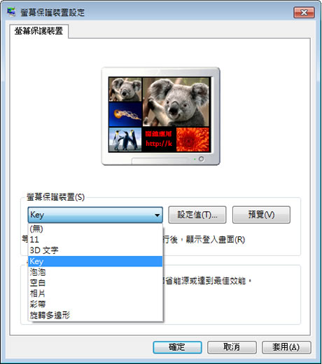 10.開啟 Windows 螢幕保護裝置設定視窗,便可看到我們剛剛安裝的螢幕保護程式。