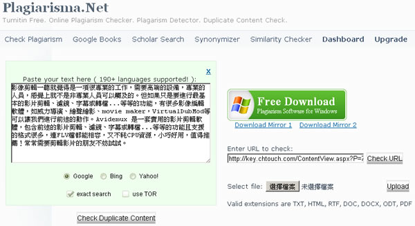 首頁線上工具檔案管理 Plagiarisma.Net 文章相似度線上檢查工具 在現今網路發達,部落格的盛行之下,多數的資訊在網路上即可輕易獲取,也因此衍生出許多著作權的問題,雖說「天下文章未必就是一大抄」的情況下,若同樣描述某個物件的文章,很難有不相同之處,亦或真的抄襲,若想要知道自己寫的文章有無被抄襲、轉貼時,可以來試試 Plagiarisma.Net 這個網站所提供的文章相似度線上檢查工具,支援 190+ 種語言,可以是文章的一個段落、一個檔案(TXT, HTML, RTF, DOC, DOCX, ODT, PDF)或是一個網址,未註冊的用戶有查詢字數 5000字的與查詢次數的限制,亦可註冊成為免費會員擺脫這部分的限制,Plagiarisma.Net 同時有提供 Windows 版本工具,不過還是要先註冊。 🔔 不錯過任何精彩! 立即訂閱我們的 LINE 官方帳號 每次發佈新文章時,您將會第一時間收到本站文章連結通知,輕鬆掌握最新資訊! 使用 LINE 追蹤文章更新 §相關文章,還可以參閱:VERT:開源本地端檔案格式轉換器,隱私優先的免費瀏覽器轉檔工具PageSplitty 線上 PDF 分割轉 JPG、PNG、WebP 圖工具,支援 5GB 大小的大檔案PixDuplicate:免上傳快速找出並刪除重複照片的免費線上工具Adapter:全方位影片、音檔及圖片格式轉換免費軟體,支援影片轉音檔與圖片,音檔及圖片格式互轉TextCompare 線上比較 Excel、PDF 及圖片,快速找出檔案不同之處 如何使用 Plagiarisma.Net? 1.進入 Plagiarisma.Net 網站後,選擇想要的查詢方式,並填入或給予相關條件後,點擊相關條件下的檢察按鈕。 2.稍後便會列出相關有相似內容的網址,供你參考。 Plagiarisma.Net網站網址:http://plagiarisma.net/
