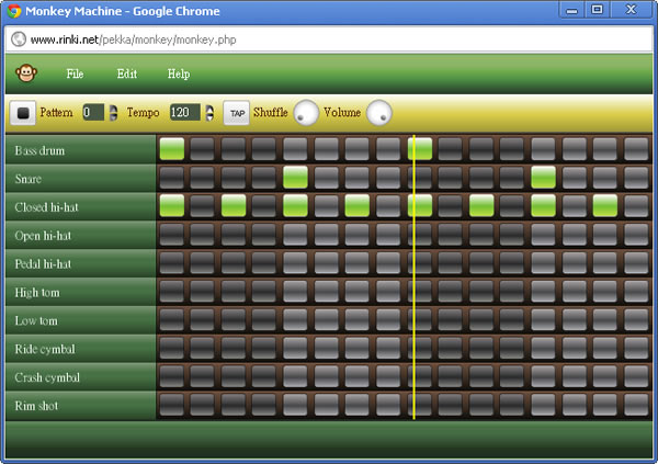 3.同意後,便會載入程式,並預設一個鼓聲節奏給你試聽,可用滑鼠點擊樂器名稱旁的四方形方塊來加入該樂器的聲音,黃色線條為目前所走到的路徑,其上方亦可調整 Tempo、Shuffle、Volume 等等。