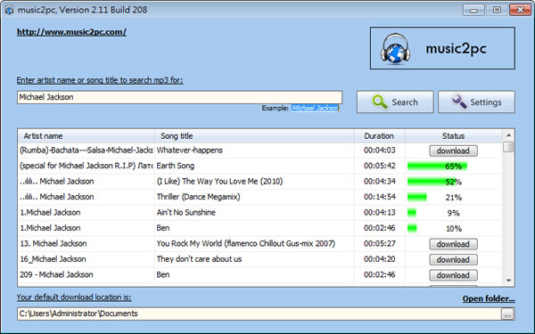 首頁電腦軟體上傳下載 music2pc - MP3 下載免費工具(免安裝) music2pc 是一套可搜尋 MP3 並下載的免費工具,採用的技術為 non-bittorrent and non-peer-to-peer 的下載方式,透過 music2pc 來搜尋到的 MP3歌曲約有 100+萬首,可以利用歌手、專輯名稱、歌名等關鍵字來做為搜尋條件,中、英文歌曲都有,不過若要搜尋中文歌手時,需使用該歌手的英文名字。 🔔 不錯過任何精彩! 立即訂閱我們的 LINE 官方帳號 每次發佈新文章時,您將會第一時間收到本站文章連結通知,輕鬆掌握最新資訊! 使用 LINE 追蹤文章更新 §相關文章,還可以參閱:ArrowDL 全平台下載利器:輕鬆批量下載 YouTube、BT、FB與多站串流影片YouTubePlaylistDownloader 支援播放清單與頻道的 YouTube 影片下載工具,還能轉換格式Parabolic 讓 yt-dlp 更好用的免費影音下載工具,支援上千個網站的影音下載Hasleo Windows ISO Downloader 幫你從微軟網站下載原版 Windows ISO 檔XMusicDownloader 從音樂網站搜尋並下載歌曲的免費應用程式 如何使用music2pc? 1.下載 music2pc 免安裝版後,滑鼠雙擊 music2pc.exe 便可開啟無須安裝,開啟後,在 Enter artist name or song tilte to search mp3 for: 處輸入關鍵字,例如介面上的 Michael Jackson 後,點擊[Search],稍後,便會列出所搜尋到的相關項目。 2.在 Your default download location is 處來調整下載後 MP3 所存放的路徑;確定後,在剛剛所搜尋到的項目選擇要下載的歌曲並點擊其後方的[download]按鈕便會開始下載,下載的速度相當快。 要找中文歌曲,利用歌手名稱的英文名來搜尋會是個較好的方法。 music2pc版本:2.22語言:英文性質:免費適用:Windows官方網站:https://music2pc.com/下載: 安裝版 按我下載 免安裝版 按我下載