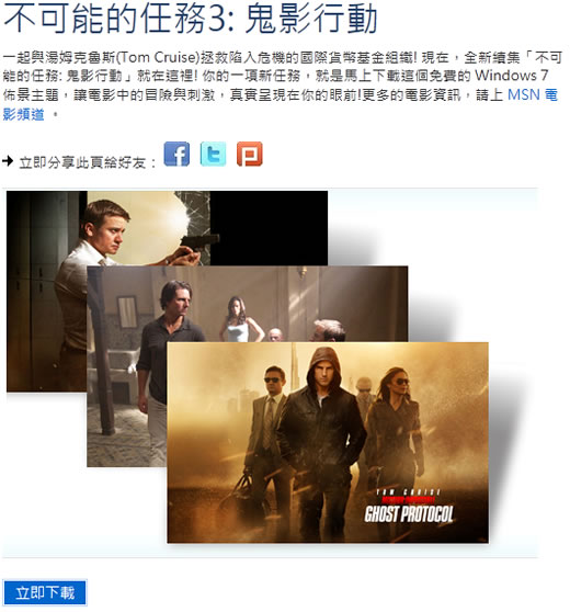 首頁電腦軟體視窗桌面 不可能的任務4: 鬼影行動 - 微軟 Windows 7 佈景主題下載 不可能的任務 - 從電視影集開始演到後由湯姆克魯斯(Tom Cruise)所擔綱不可能的任務電影系列內的男主角,且也陸續的不斷推出續集,估計會像 007 系列了,不可能的任務最新續集「不可能的任務4: 鬼影行動」其主要任務為拯救陷入危機的國際貨幣基金組織而引發一連串的冒險與刺激,不過不論有沒有看過該續集,微軟已推出 Windows 7 不可能的任務4: 鬼影行動的佈景主題供你免費下載,讓你桌面也有不可能的任務。 🔔 不錯過任何精彩! 立即訂閱我們的 LINE 官方帳號 每次發佈新文章時,您將會第一時間收到本站文章連結通知,輕鬆掌握最新資訊! 使用 LINE 追蹤文章更新 §相關文章,還可以參閱:Windows 官方桌布商店來了!超過 400 款風格包,從遊戲到國家公園通通有微軟 City Art Search 自動將 10400多幅世界名畫設置成 Windows 鎖定螢幕畫面Digital Clock 4 可靈活自訂的桌面時鐘,支援報時、計時器、鬧鐘等多款附加套件TrafficMonitor 在 Windows 桌面上顯示網路上傳與下載的即時網速「免費下載」故宮博物院 2023 兔年月曆桌布 如何下載與安裝 不可能的任務4: 鬼影行動 - 微軟 Windows 7 佈景主題下載? 1.進入微軟不可能的任務4: 鬼影行動佈景主題詳細介紹網頁後,點擊該佈景主題的下方[立即下載]按鈕。 2.安裝完成後,便會自動開啟個人化設定視窗,滑鼠點擊剛剛所安裝的 Mission Impossible - Ghost Protocol 便可將桌面背景置換。 3.安裝好的不可能的任務4: 鬼影行動 佈景主題。 不可能的任務4: 鬼影行動佈景主題性質:免費官方網站:http://windows.microsoft.com/zh-TW/windows/downloads/mission-impossible-ghost-protocol-theme下載:按我前往
