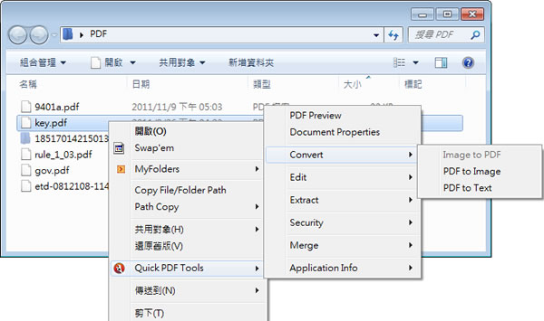 首頁電腦軟體文書編輯 Quick PDF Tools 整合開啟 、合併、轉換、新增與移除密碼的 PDF 免費工具集 PDF 文件格式具有可跨平台、保全等等特性,逐漸成為大家喜愛用的一種文件格式,不論是免費或需付費,相關工具也相繼產生,Quick PDF Tools 分為付費與免費兩種版本,若是一般使用者,免費應該很夠用了。 🔔 不錯過任何精彩! 立即訂閱我們的 LINE 官方帳號 每次發佈新文章時,您將會第一時間收到本站文章連結通知,輕鬆掌握最新資訊! 使用 LINE 追蹤文章更新 §相關文章,還可以參閱:PDF Arranger 可調整順序、刪除、旋轉...的多功能 PDF 工具程式Text Replacer 文字替換免費工具如何在 PDF 文件裡添加額外的文字、圖片、圖形或繪圖?Notepad++ 免費多功能記事本軟體doPDF 可在任何程式中藉由[ 列印 ]功能來建立 PDF 檔案 Quick PDF Tools 免費版具有下列功能: 將所有功能整合到滑鼠右鍵選單,免除需開啟 PDF應用程式步驟 整合 PDF 文件開啟、合併、將圖片轉換成 PDF 文件 新增或移除 PDF 密碼 將 PDF 文件每頁轉換成一個圖檔 提取 PDF 文件中的文字,中文也沒問題 另外,若有需要還可參考下列相關免費工具: Convert PDF To Word、Word To PDF - 線上免費的PDF轉Word、Word轉PDF的網站,無需下載軟體,使用超方便 Appnimi PDF Unlocker 移除 PDF 密碼及相關保全等限制 Doro PDF Writer 虛擬 PDF 印表機,讓任何程式中藉由[列印]命令來建立 PDF 檔案並可設定保全密碼 PDFUnlock 線上移除 PDF 檔案內的保全設定 Print2Flash 將各種文件格式,輕鬆轉換成 Flash 格式 如何使用 Quick PDF Tools? 1.完成安裝後,可在 PDF 文件上,使用滑鼠右鍵點擊,便可看到功能項目。 其中常用的: PDF Preview:開啟 PDF 檔案 Document Properties:檢視 PDF 文件屬性 Convert> Image to PDF 將圖片轉換成 PDF 文件 PDF to Image:將 PDF 轉換成圖檔 PDF to Text:將 PDF 文件轉換成文字檔 2.Extract 提取 PDF 文件中的文字或是將 PDF 文件每一頁轉換成一個圖檔。 3.Security 新增或移除 PDF 開啟時的密碼。 4 利用 Extract > Text > formatted Text 所提取出 PDF 文件中的文字。 Quick PDF Tools版本:2.1.6.1語言:英文性質:免費適用:Windows官方網站:http://www.debenu.com/quick-pdf-tools/index.php下載:按我下載