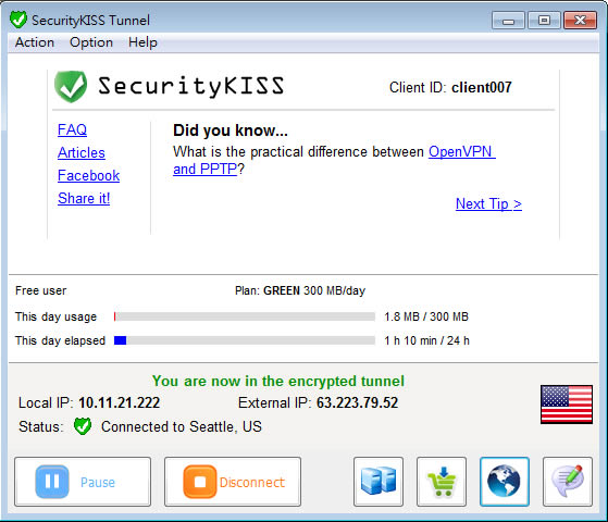 在公司或是學校上網,通常會有所限制,例如在學校使用學術網路,想要連到大陸時,會有所限制,或是在公司想要忙裡偷閒,連到娛樂休閒網站,又被網管封鎖,碰到這種情形很多人會找代理伺服器來突破管制,或是使用像是無界、自由門等軟體來應用,不過要找到好的代理伺服器不容易,這時候可以來試試 SecurityKISS Tunnel 這套免費虛擬 VPN(Virtual Private Network - 虛擬專用網路),速度還不錯,讓你透過公用的網路架構(例如:網際網路)來傳送網際網路的訊息,不過免費版每日有 300MB 的流量限制,不用時可以先暫停,且只提供美國與英國的 IP,不過若不是要下載檔案,應該是相當足夠的。