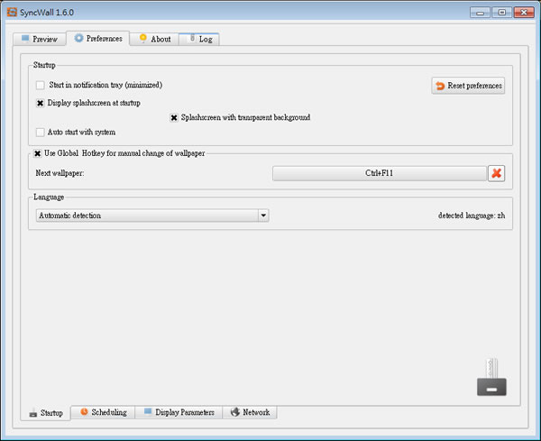 2.在 Preferences 的 Startup 頁籤中,可設定 SyncWall 是否隨電腦開機而啟用與是否使用快速鍵更換桌面背景等。