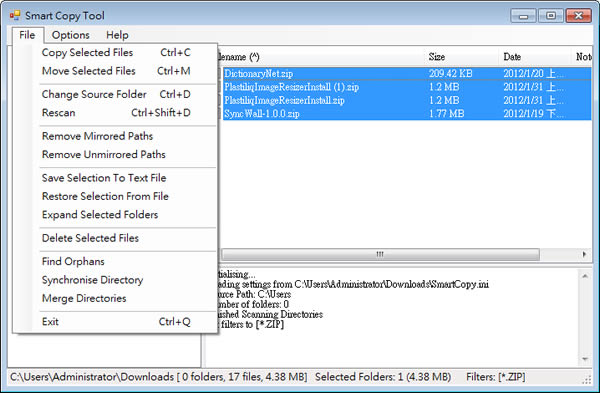 首頁電腦軟體檔案管理 SmartCopyTool 檔案複製、移動與刪除篩選工具(免安裝) Windows 系統內建的檔案複製、移動與刪除工具功能有限,若想將相同類型的檔案複製、移動與刪除,可能需要先搜尋後才能動作,步驟有點繁複。而 SmartCopyTool 這套免費的檔案複製、移動與刪除工具,除具備 Windows 相同的複製、移動與刪除功能外,更可設定篩選檔名或附檔名條件來進行複製、移動與刪除,相當適合想分類檔案又懶得一個個來查看的人來使用。 🔔 不錯過任何精彩! 立即訂閱我們的 LINE 官方帳號 每次發佈新文章時,您將會第一時間收到本站文章連結通知,輕鬆掌握最新資訊! 使用 LINE 追蹤文章更新 §相關文章,還可以參閱:檔案好多重複怎麼辦?免費 dupeGuru 幫你一鍵清出電腦空間[ 免費使用 ]PDFgear 整合各種 PDF 工具,具格式轉換、編輯、合併或拆分等功能7-Zip 檔案壓縮與解壓縮免費軟體AmoK Exif Sorter 讓照片按拍照日期重新命名並自動分類的免費軟體PDF Unshare 限制 PDF 檔案的讀取有效日期 如何使用 SmartCopyTool? 1.開啟 SmartCopyTool,選擇要篩選的資料夾或磁碟機後,便會列出該目錄下的資料夾或檔案。 2.若要篩選檔案類型,可點擊[Options] > [Set Filters]。 3.篩選出的檔案,可使用滑鼠單一來選擇或使用滑鼠右鍵來全選或取消選擇。 4.點擊[File] > 來選擇檔案要操作的動作。 SmartCopyTool 相當類似 Windows 內建的搜尋與複製、移動與刪除功能的結合應用 SmartCopyTool版本:1.0.0.1語言:英文性質:免費適用:Windows官方網站:http://sourceforge.net/projects/smartcopytool/下載:按我下載