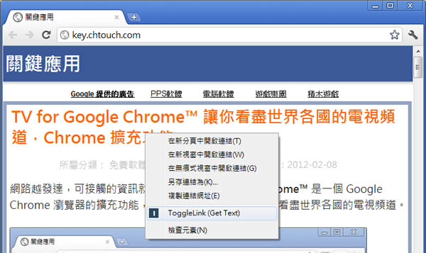 首頁瀏覽器擴充功能生產力工具 ToggleLink 複製超連結的文字更快更方便,Google Chrome 擴充功能 在網頁裡,若要取出含有超連結的文字,需要先將該段文字選取再按下滑鼠的右鍵,點選[複製]才能複製超連結內的文字,這樣子的步驟有點多,且要將該段超連結選取,一不小心就會變成點擊,跑到該連結的網址,若是要複製超連結其中的文字,那可能還需要多幾個步驟,若你使用 Google Chrome 瀏覽器時,這時候可以來試試 ToggleLink 這個 Chrome 的擴充功能,讓你複製超連結的文字更快更方便。 🔔 不錯過任何精彩! 立即訂閱我們的 LINE 官方帳號 每次發佈新文章時,您將會第一時間收到本站文章連結通知,輕鬆掌握最新資訊! 使用 LINE 追蹤文章更新 §相關文章,還可以參閱:Bing Chat sidebar for Chrome 讓 Chrome 在側邊欄就能使用 Bing Chat(瀏覽器擴充功能)如何在 Chrome 瀏覽器也能使用全新的 Bing AI?「UseChatGPT.AI」快速編寫、改寫、總結、解釋或翻譯網站上的任何文章 (瀏覽器擴充功能)WebChatGPT 結合網路搜尋資料,讓 ChatGPT 整合資訊沒有時間限制(瀏覽器擴充功能)ChatGPT Prompt Genius 將 ChatGPT 對話內容完整的匯出成 PNG、PDF、MD 檔或分享網址(瀏覽器擴充功能) 如何使用 ToggleLink ? 1.使用 Chrome 瀏覽器到達 ToggleLink 安裝網址後,點擊[ADD TO CHROME]便會開始下載及安裝。 2.安裝完成後,會出現提示。 3.應用時,將滑鼠放到超連結的位置後,按下鍵盤的[Shift]按鍵,該段文字的超連結便會被移開 5秒,方便你像往常般的選取、複製。 4.另外種方法是在超連結上,使用滑鼠右鍵點擊後,再點選[ToggleLink(Get Text)]也可以。 ToggleLink性質:免費官方網站:https://chrome.google.com/webstore/detail/pihmbjnaeenimjokcejnenhppigofjdi