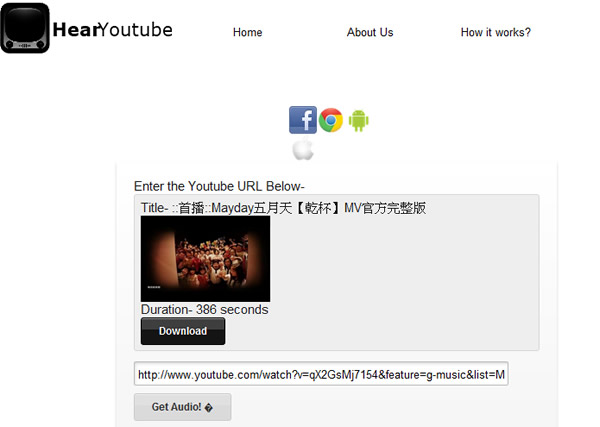 首頁線上工具檔案管理 HearYoutube - Youtube 影片轉 MP3 免費服務 想要下載 YouTube 影音網站上的音樂,可以來試試 HearYoutube 這個可將 Youtube 影片轉 MP3 免費服務,只要輸入 Youtube 影片網址,即可轉檔與下載,簡單好用。 🔔 不錯過任何精彩! 立即訂閱我們的 LINE 官方帳號 每次發佈新文章時,您將會第一時間收到本站文章連結通知,輕鬆掌握最新資訊! 使用 LINE 追蹤文章更新 §相關文章,還可以參閱:VERT:開源本地端檔案格式轉換器,隱私優先的免費瀏覽器轉檔工具PageSplitty 線上 PDF 分割轉 JPG、PNG、WebP 圖工具,支援 5GB 大小的大檔案PixDuplicate:免上傳快速找出並刪除重複照片的免費線上工具Adapter:全方位影片、音檔及圖片格式轉換免費軟體,支援影片轉音檔與圖片,音檔及圖片格式互轉TextCompare 線上比較 Excel、PDF 及圖片,快速找出檔案不同之處 如何使用 HearYoutube? 1.進入 HearYoutube 網站,輸入要下載的 Youtube 影片網址,按下[Get Audio!]後,便會列出該網址的影片資訊。 2.確定是要下載的歌曲後,點擊[Download],便可下載。 HearYoutube網站網址:http://www.hearyoutube.com/