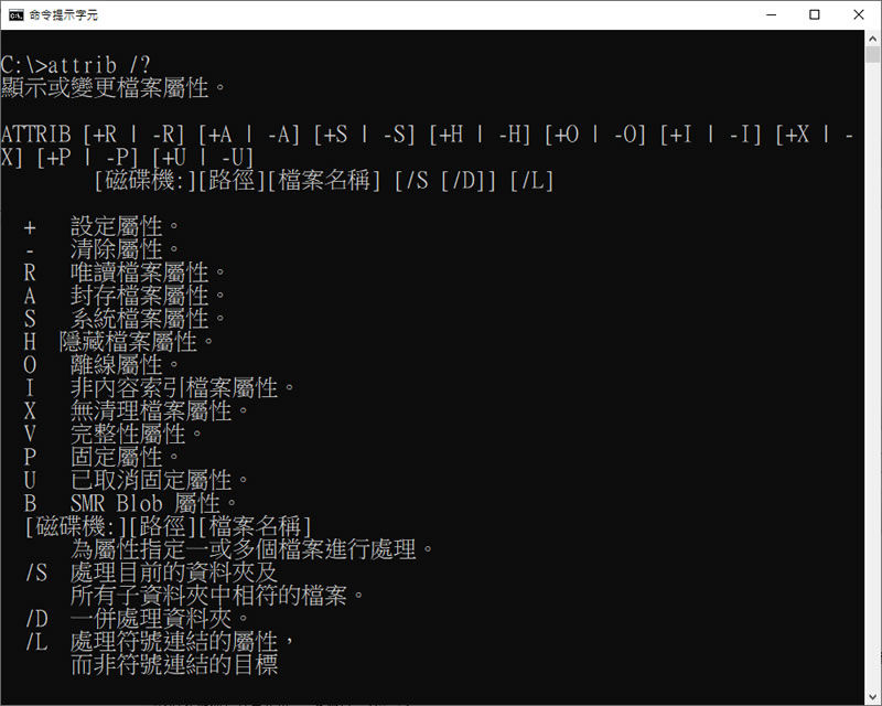 首頁操作技巧Windows 指令 [ 命令提示字元 ]如何利用 attrib.exe 指令,隱藏檔案或資料夾? 想要在 Windows 系統內隱藏檔案或資料夾,有些人會使用像是 Free Hide Folder 工具協助,若偶而使用時,其實可以利用 Windows 系統內建的 attrib 指令,便可改變檔案或資料夾的屬性,達到隱藏檔案或資料夾的目地,不過使用這種方法也並非萬無一失,須注意較容易被其他人取消隱藏的屬性,而顯示出受保護的檔案或資料夾,可參閱 [ Windows]如何顯示檔案的副檔名及被隱藏保護的檔案。 🔔 不錯過任何精彩! 立即訂閱我們的 LINE 官方帳號 每次發佈新文章時,您將會第一時間收到本站文章連結通知,輕鬆掌握最新資訊! 使用 LINE 追蹤文章更新 §相關文章,還可以參閱:如何測試 SSD 速度?Windows 內建指令一行搞定硬碟測速如何在 Windows 中一次建立多個資料夾如何在 Windows 中使用 PowerShell 列出軟體安裝與解除安裝記錄如何使用「命令提示字元」或「PowerShell」指令取得目前 CPU 溫度?「Windows PowerShell」如何將指令結果直接輸出成文字檔? 如何使用 attrib.exe 指令,隱藏檔案或資料夾? 1.開啟「命令提示字元」,輸入 attrib /? 後,按下鍵盤的 Enter 鍵,便可列出相關參數用法。 2.假設 d 磁碟機下有一 privatephoto 資料夾,我們想對其隱藏,便可以使用 attrib.exe +S +H D:\privatephoto 指令,可參考如下範例。 3.若要刪除該屬性,同樣指令 + 改成 - 號即可。 4.如果資料夾名稱內含有空格時,例如 D:\private photo 則需要使用雙引號刮住成 attrib.exe +S +H "D:\private photo"。