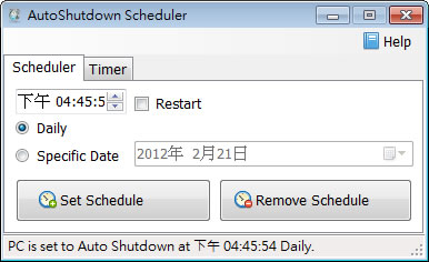 首頁電腦軟體生產力工具 AutoShutdown Scheduler 最簡單的關機程式,可排程或計時 希望在指定的日期與時間電腦可以重新開機或預計目前工作可在幾個小時後結束就關機,若不用其他軟體輔助,可以參考 善用Windows 7內建的工作排程器,設定電腦定時自動關機、休眠或自動重開機!,若是覺得麻煩,也可以來試試這個絕對沒有門檻,任何人都會使用的 AutoShutdown Scheduler 最簡單的關機或重新開機程式,程式中可排程或使用計時器來關機或重新開機,且免安裝,要用時在開啟就好。 🔔 不錯過任何精彩! 立即訂閱我們的 LINE 官方帳號 每次發佈新文章時,您將會第一時間收到本站文章連結通知,輕鬆掌握最新資訊! 使用 LINE 追蹤文章更新 §相關文章,還可以參閱:AingDesk:一鍵安裝 Ollama AI 模型管理器,讓 LLaMA、DeepSeek 在本機電腦上運行Arc 瀏覽器正式登陸 Windows 11,開啟全新瀏覽體驗!Norton Secure Browser 使用 Chromium 核心的瀏覽器,有廣告封鎖和隱私保護功能BingGPT 桌面應用程式,讓你不用 Edge 也能用 Bing 聊天機器人SlippyClerk 數字、英文字母有序字串產生器 可自訂前後綴字詞 如何使用 AutoShutdown Scheduler? 1.執行「AutoShutdownScheduler.exe」執行檔,便可開啟,無須安裝,開啟後,預設會是在[Scheduler]排程頁籤,可定義好要執行的時間,若勾選[Restart]代表要重新開機,設定好便可按下[Set Schedule]按鈕。 Daily:每日執行 Specific Date:特定日期執行一次 2.若要使用計時器,可切換到[Timer]頁籤,設定好要關機的時間,按下[Set Timer]按鈕,便可啟動計時器,若要移除計時器,可按下[Remove Timer]按鈕。 AutoShutdown Scheduler版本:1.0語言:英文性質:免費適用:Windows官方網站:http://rbsoft.weebly.com/autoshutdown-scheduler.html下載:按我下載