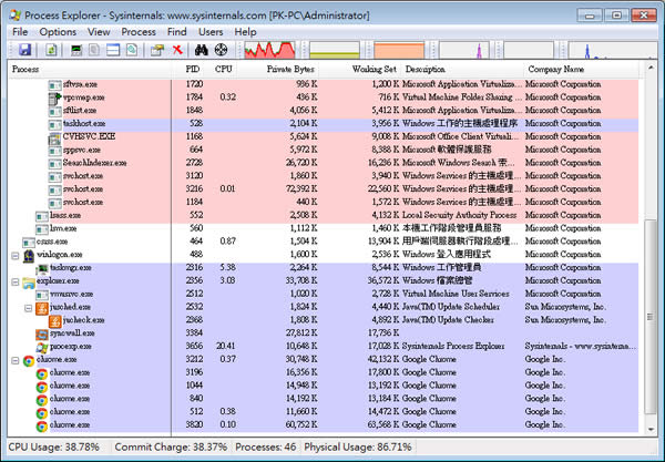 首頁電腦軟體系統應用 Process Explorer 更詳盡的「Windows 工作管理員」(免安裝) 每當有應用程式當掉或 Windows 系統反應變慢的狀況時,通常會開啟 Windows 內建的「工作管理員」然後切換到[處裡程序]頁籤來查看原因或直接關閉應用程式等,不過若發覺 Windows 內建的「工作管理員 - 處裡程序」所提供的資訊並不是很詳細,可以來試試 Process Explorer 這套等同由微軟開發的免安裝又免費的應用工具,不僅具有原「工作管理員 - 處裡程序」的監視、終止進程與檢視 CPU 活動、記憶體使用、磁碟 I/O、網路活動等等情況外,還可以檢視程序所開啟的 DLL 檔案,若遇到自己不熟悉的程序還可以直接通過預設的搜尋引擎直接連到網路來搜尋,相當方便。 🔔 不錯過任何精彩! 立即訂閱我們的 LINE 官方帳號 每次發佈新文章時,您將會第一時間收到本站文章連結通知,輕鬆掌握最新資訊! 使用 LINE 追蹤文章更新 §相關文章,還可以參閱:CatLock:可鎖定鍵盤的 Windows 應用程式,防止寵物意外觸碰Zen Ad blocker 瀏覽器與應用程式均適用的廣告攔截器,免費且開放原始碼TimVer 一站式顯示 Windows 版本及電腦硬體相關訊息的工具「微軟電腦管家」內含開機啟動項目管理、儲存空間最佳化等免費工具 全方位提升電腦效能Windows Startup Timer 測量 Windows 從開機到完全啟動所需時間 如何使用 Process Explorer ? 1.解壓縮後,執行「procexp.exe」便可開啟,無須安裝,開啟後,Process Explorer 就如同 Windows 內建的「工作管理員 - 處裡程序」 會列出正在執行的所有程序,且會以樹狀結構,將相同的程序使用相同顏色區分開來。 2.可透過滑鼠右鍵的點擊來對程序進行處裡。 3.點擊[View] > [System Information...]可將目前的活動即時顯示 4.點擊[Options] > [Tray Icons]可將圖示顯示在工作列的系統通知區域內。 Process Explorer版本:16.42語言:英文性質:免費適用:Windows官方網站:https://docs.microsoft.com/zh-tw/sysinternals/downloads/process-explorer下載:按我下載