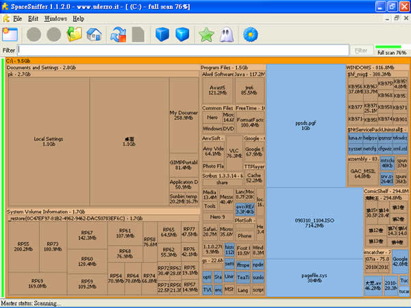 磁(硬)碟使用過一段時間後,常會發現空間不足,這時候如果要自己打開檔案總管一個一個去看到底被什麼檔案給佔滿了,很多人也許會舉雙手投降,這時候如果有工具軟體,用圖形化的方式來報告磁(硬)碟分割區或資料夾裡面空間的佔用情形,讓你一目了然,也許你就知道該刪除檔案或增加磁(硬)碟的空間了。SpaceSniffer 是一套磁(硬)碟空間分析工具,它不但能以區塊、數字及顏色來顯示硬碟各個檔案及資料夾的大小,還提供篩選器來過濾出想要找的檔案,更可以點擊畫面中的區塊,直接進入該資料夾中取得更詳細的資料。